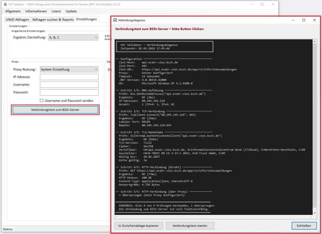 Im aktuellen VAT Validator finden Sie in den Einstellungen einen Verbindungstest zum BZSt Server. Wenn Sie eine Abfrage starten, die eine allgemeine Verbindungsfehler zurückgibt können Sie diese Diagnose nutzen, um mehr über das eigentliche Problem zu erfahren.